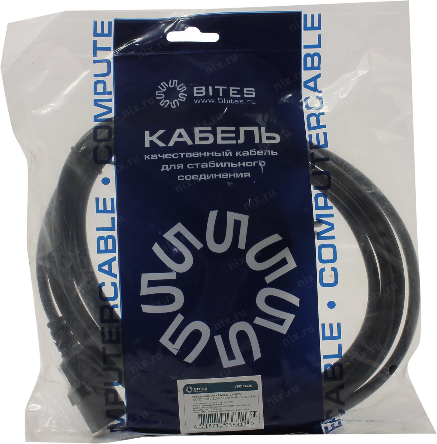 Производитель 5bites, Модель VDE107530, Тип оборудования Кабель силовой компьютер - розетка 220V, Длина кабеля 3 метра, Цвет Черный